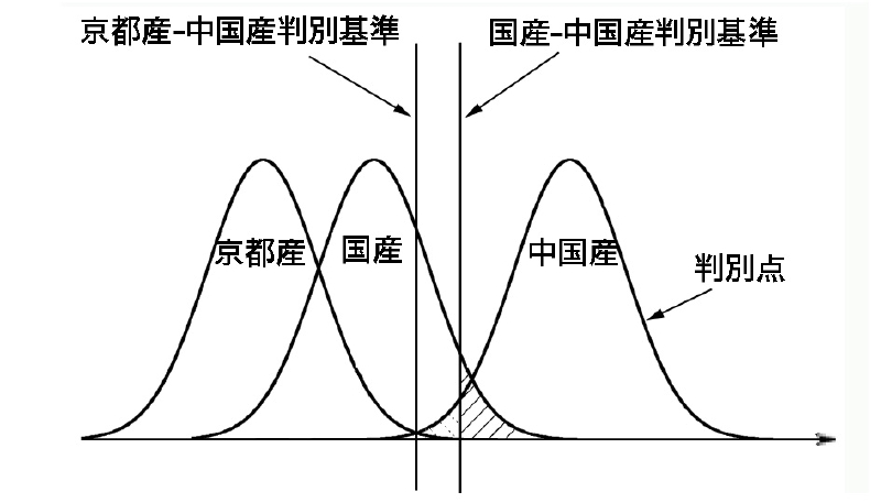産地判別で判別精度が例えば95%とある場合、A産地とB産地を95%は正しく判別できますが、データから得られた判別点が二つの産地の境界(判別基準)付近で重なり合う部分が全体の5%有り、この部分は、誤判別の可能性が生じます。 この場合、判別の的中率(精度)は95%となります。判別の精度を高める為には、判別をしようとする産地グループの安定同位体比値が重なり合うものが少ないほど、つまり地域環境の相違が大きく、安定同位体比値の差が明瞭となるほど判別の精度は高まります。 例えばタケノコを例にとると、京都産のタケノコの安定同位体比値は、中国とは明瞭に異なります。 しかし、九州産のタケノコは、中国と生育環境(緯度や生育地域の環境)が似ている為、安定同位体比値もより似通った値となります。 この為、判別を行う場合でも、九州・京都をひとまとめで国産-中国産と判別するよりも、京都と中国で判別した方が精度が高くなります。(右図のように、京都産と中国産は、より明瞭に判別されるので、由来が具体的であるほど、判別精度が高い事が示されます。
